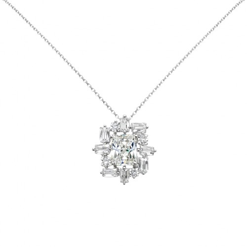 Ασημένιο κολιέ με εντυπωσιακό μοτίφ που διακοσμείται από καρέ και ορθογώνιες ζιργκόν πέτρες. Η κεντρική είναι σε υπόλευκη απόχρωση. Ένα λαμπερό κόσμημα λαιμού για βραδινές εμφανίσεις.
