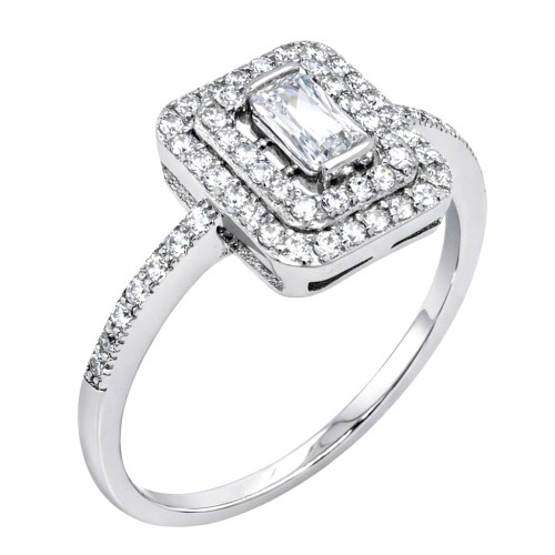 Ορθογώνια ροζέτα ασημένιο δαχτυλίδι σε γραμμή ευκολοφόρετη, διακοσμημένο με ζιργκόν λευκές πέτρες.