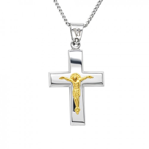 Βαπτιστικός σταυρός από ασήμι 925 και χρυσό 14 καρατίων, με τον Εσταυρωμένο. Ο σταυρός είναι κατασκευασμένος από ασήμι 925 και ο Χριστός από χρυσό 14κ. Το κόσμημα φοριέται και από τη πίσω ζαγρέ όψη και συνοδεύεται από ασημένια αλυσίδα με μήκος 55 εκατοστά.