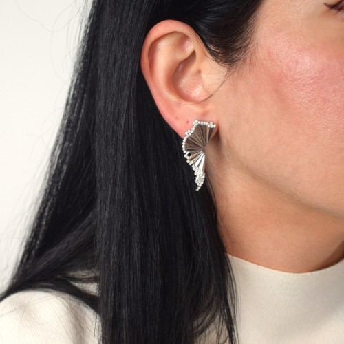 Ασημένια σκουλαρίκια “βεντάλια” με λευκά ζιργκόν στις εξωτερικές πλευρές. Μοντέρνα κι εντυπωσιακά σκουλαρίκια που θα σας συντροφεύσουν σε βραδινές εξόδους.