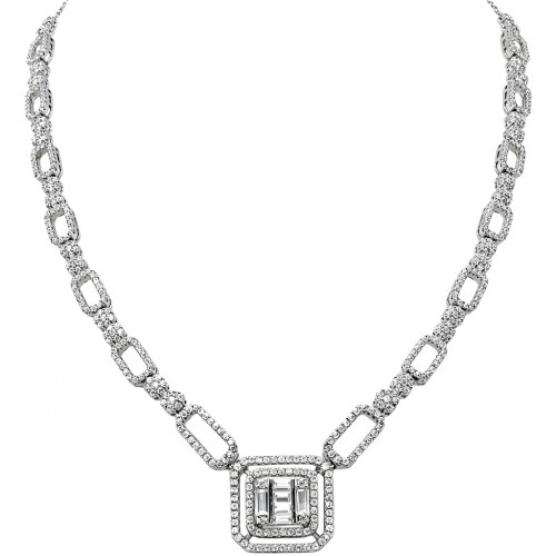 Κολιέ αποτελούμενο από statement και αλυσιδωτό μέρος, από ασήμι 925, με λευκές ζιργκόν πέτρες σε κοπή ορθογώνια και στρογγυλή. Μπορείτε να το συνδυάσετε με το αντίστοιχο βραχιόλι, ζευγάρι σκουλαρίκια και δαχτυλίδι.