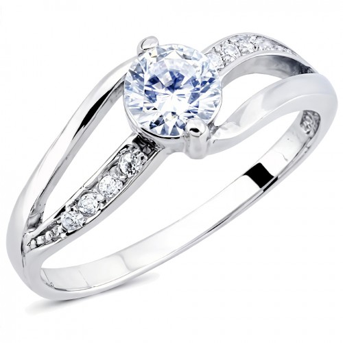 Μονόπετρο δαχτυλίδι από λευκό χρυσό 14 καρατίων, με διπλή γάμπα και λευκές πέτρες ζιργκόν. Το κόσμημα αποτελεί ιδανική επιλογή για δαχτυλίδι πρότασης γάμου.