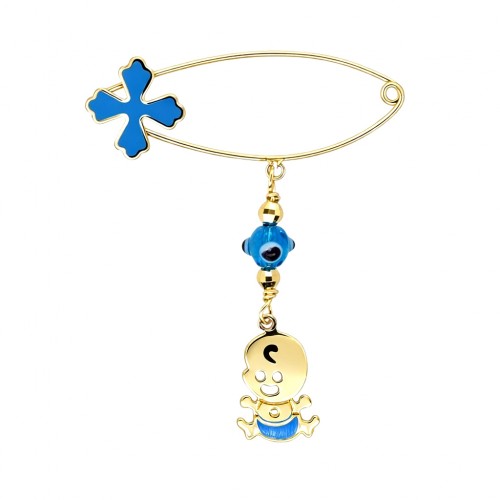 Αγορίστικη χρυσή παραμάνα 9 καρατίων για νεογέννητο, με σταυρό, μωράκι και ματάκι. Ένα πρώτο ενθύμιο που δωρίζεται και στη βάπτιση.