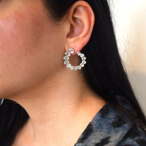 Σκουλαρίκια γάμου από ασήμι 925, σε σχήμα “πέταλο”. Διακοσμούνται με λευκές ζιργκόν πέτρες στρογγυλής και ορθογώνιας κοπής, που δημιουργούν ιδιαίτερη λάμψη στα οβάλ καστονάκια τους.