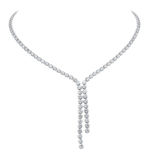 Ασημένιο κολιέ ριβιέρα σε γραμμή “γραβάτα” με λευκές πέτρες ζιργκόν. Γίνεται σετ με τα αντίστοιχα σκουλαρίκια και φοριέται σε επίσημες περιστάσεις.