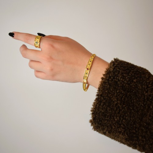 Βυζαντινής τεχνοροπίας ασημένιο επίχρυσο δαχτυλίδι, με μπλε, κόκκινο και πράσινο ζιργκόν. Προτιμήστε το ως δώρο στη γυναίκα που αγαπά τα διαχρονικά κοσμήματα με στιλ.