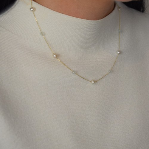 Χρυσό κολιέ Κ14 με μαργαριτάρια και aquamarine