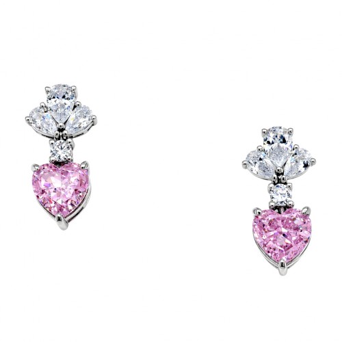 Κρεμαστά σκουλαρίκια καρδιές, από ασήμι 925, με λευκά και ροζ ζιργκόν. Ένα διακριτικό κόσμημα που φοριέται σε βραδινές κι επίσημες εξόδους.